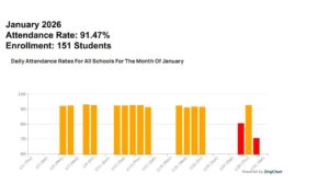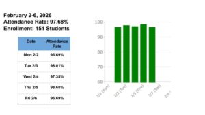 We welcomed February with strong attendance! Your commitment and support in ensuring our Superstars attend school every day when they are healthy is important and instrumental to the success of all of our Superstars! By prioritizing consistent attendance, you aren’t just helping your own children stay on track; you are strengthening the learning environment for every classmate. When our classrooms are filled with our students, Walnut Square teachers can provide the most engaging and effective instruction for the whole school team. Please click on the images below to enlarge them to view this week’s attendance rate and the daily attendance rates for January.